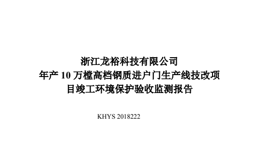 根据《国务院关于修改〈建设项目竣工环境保护管理条例〉的决定》(国务院令第682号),以及环保部《关于发布<建设项目竣工环境保护验收暂行办法>的公告》(国环规环评[2017]4号),现将浙江龙裕科技有限公司年产10万樘高档钢质进户门生产线技改项目竣工环境保护验收报告…